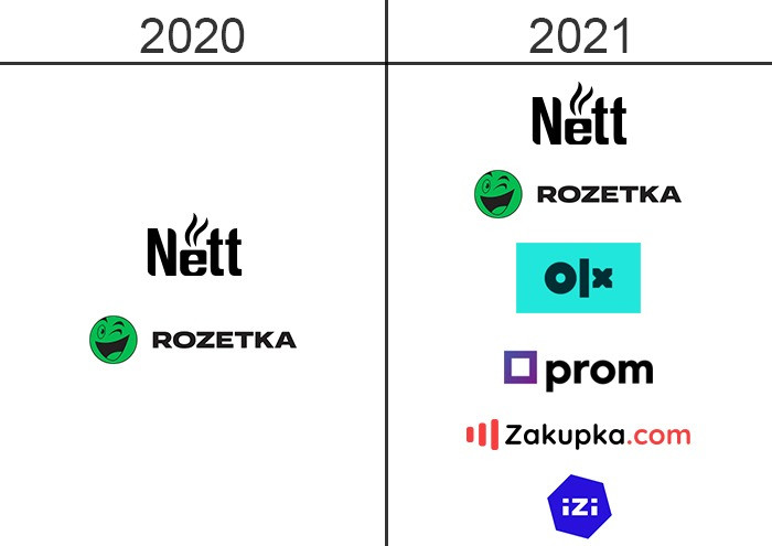 - За 2021 год товары Nett стали доступны к покупке на таких маркетплейсах, как Rozetka.ua; Epicentr.ua; Prom.ua; OLX.ua; Zakupka.ua; Izi.ua и др.(см.8)